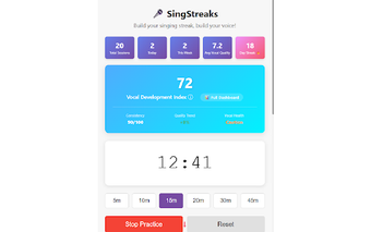 SingStreaks는 일관된 연습을 통해 가창 기술을 향상시키려는 가수를 위해 설계된 Chrome 추가 기능입니다. 이 무료 도구는 스마트 연습 타이머, 포괄적인 세션 기록 및 연습 일관성과 음성 건강을 기반으로 진행 상황을 측정하는 독특한 음성 개발 지수(VDI)와 같은 기능을 통해 사용자가 노래 세션을 추적하는 데 도움을 줍니다. 직관적인 디자인은 쉬운 탐색을 가능하게 하며, 연속성과 이정표와 같은 게임화 요소로 사용자가 매일 습관을 기르도록 장려합니다.